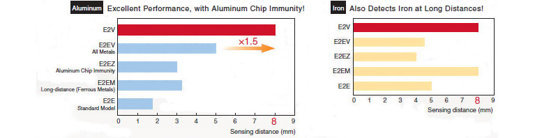 Благодаря невосприимчивости к алюминиевой стружке датчики обеспечивают обнаружение на большом расстоянии только обрабатываемых алюминиевых объектов. Аналогичные параметры обнаружения разработаны и для железных объектов. Это означает, что E2V-X[] может находиться на значительно большем расстоянии от деталей из любого из названных металлов, чем любой другой бесконтактный датчик.
