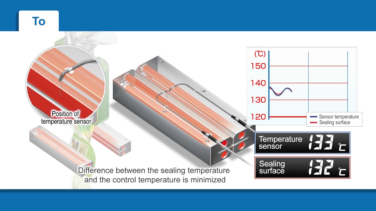 На традиционных упаковочных машинах датчики температуры часто располагаются слишком далеко от поверхности пайки нагревательной планки. Это приводит к различию температуры поверхности пайки и фактически контролируемой температуры. Эта разница температур и происходящие из-за нее ошибки возрастают при увеличении скорости упаковки, а также при использовании более тонких упаковочных материалов или изменении температуры окружающей среды.