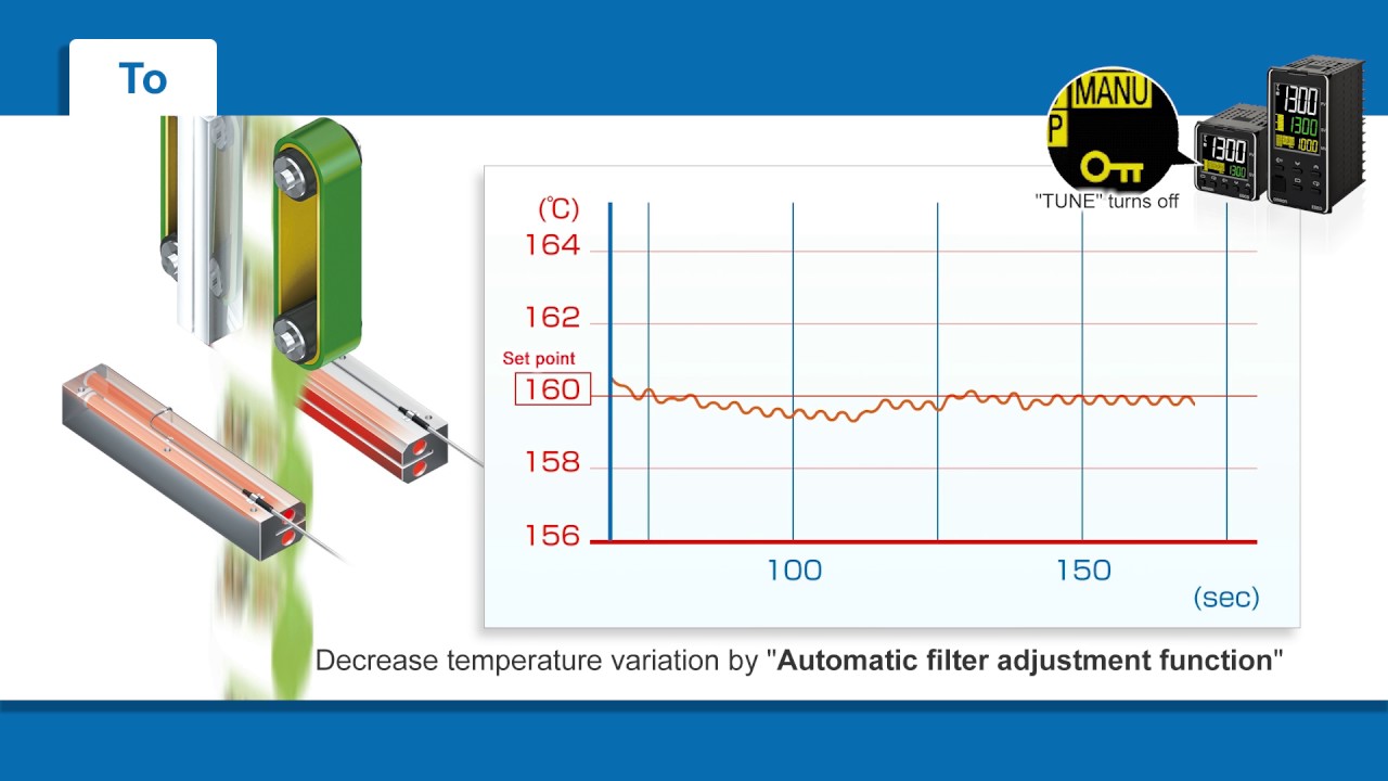 При использовании стандартных контроллеров температуры помимо очень долгого периода определения исходных настроек PID-регулирования при запуске, также очень сложно определить оптимальные настройки без многолетнего опыта работы в данной области. Поэтому компания Omron разработала серию E5_D с «технологией адаптивного управления». Данная технология автоматически определяет изменения в контролируемом процессе и соответствующим образом адаптирует настройки PID.